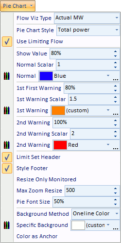 The relevancy of pie charts and gauges depends on the style of the pie chart or gauge. For MVA, MW, Mvar and Amp styles, the pie charts are considered irrelevant if the limits on the line or interface are 0. For max percent loading under contingency, the pie chart is irrelevant if no violation(s) under contingency occurred on the element. For the PTDF style, the pie chart is invalid if the PTDF value has not been calculated for the line or interface.
