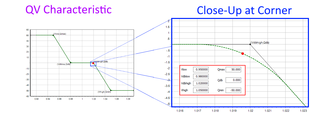 The QV characteristic each user-defined point creates a discontinuous derivative in the QV characteristic. (dQ/dV will suddently change). That will cause a lot of trouble for any iterative solution techniques used to solve a power flow solution. To prevent this from occurring, PowerWorld implements various numerical approximations of the QV characteristic to smooth the transition at these corner points. In addition there are hard-coded restrictions that the voltage transition points must be at least 0.001 per unit (apart) and restrictions on steep the slopes can be on the QV characteristic. You will not notice any of this is going on unless you look very closely at the power flow solution when operating right near these transition points.