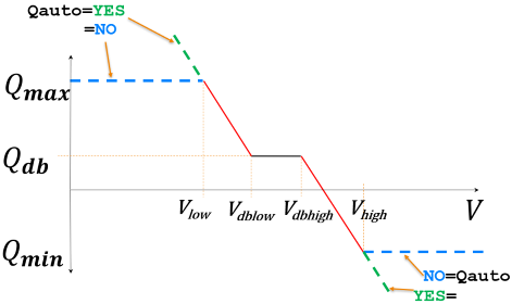 It may also be convenient to specify that the Qdb, Qmax, and Qmin values be automatically calculated based on the summation of generator MvarMax and MvarMin, and Qdb is assumed to be 0.0. (If both Qmax and Qmin are the same sign, then Qdb is assumed to be either Qmax or Qmin depending on which value is closer to 0.0. When automatically determine the reactive thresholds for this curve, there is no need to actually enforce those limits in the QV Characteristic curve. Instead we can just rely on the individual generators to enforce their Mvar limits. As a result the QV characteristic curve would change as depicted in the following image. When Qauto is chosen then the red line extrapolates out as shown in the green dashed line.