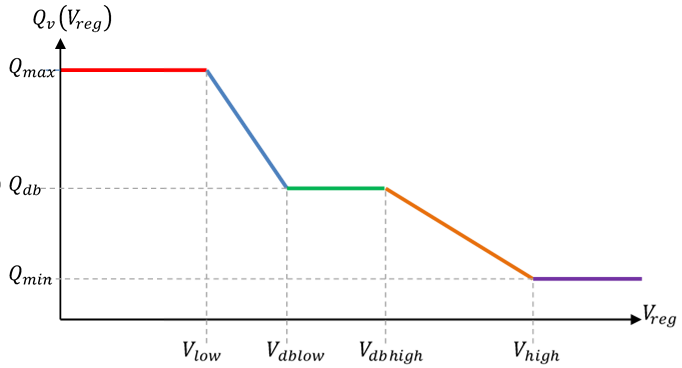 In this configuration, it is common for the renewable generation plant to operate so that at the point of interconnection (bus 1) when the voltage is between Vdblow and Vdbhigh the plant operates at a fixed reactive power output Qdb (often 0.0). Then below the Vdblow threshold the reactive power increases linearly until it is at a specified Qmax at a voltage of Vlow, and above the Vdbhigh threshold the reactive power decreases linearly until it is at a specified Qmin at a voltage of Vhigh. This is depicted in the next image.