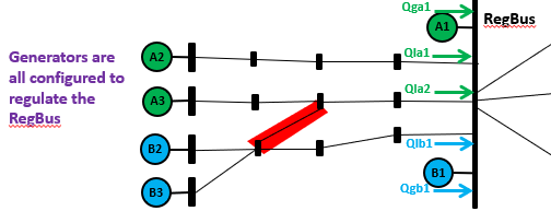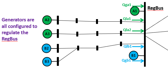 In the example shown in this image, there are two separate VoltageDroopControl objects defined (Green and Blue), however all 6 generators shown regulate the same bus (RegBus). Software tools can easily automatically determine the list of "arriving branches" in this case so PowerWorld automatically determines that Qla1 and Qla2 go with VoltageDroopControl A and Qlb1 goes with VoltageDroopControl B. In addition, it is valid to have some generators in the VoltageDroopControl be located at the RegBus itself as well, so this is automatically detected for generator MVar outpus Qga1 and Qgb1.