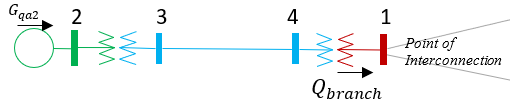 This type of voltage control is distinctly different than features such as remote voltage regulation used in other features of the software. They are different because in all other voltage control features the reactive power flows used in the algorithms are the generator Mvar outputs directly. For Voltage Droop Control, the reactive power is the flow arriving at the point of interconnection bus and thus is the reactive flow on the AC branch arriving at Bus 1 and coming from bus 4 shown as Qbranch in the figure above.