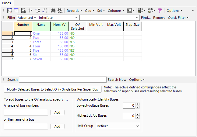By default, the table lists all buses in the case. This table is a bus case information display and filtering can be applied to this table to make the selection of buses easier. Several QV-specific fields are listed by default: