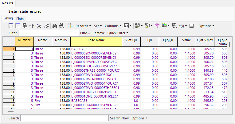 The Listing sub-tab is found on the Results page of the QV Curves dialog. This page provides a summary of all scenarios studied and their results. This table will update as the analysis progresses.