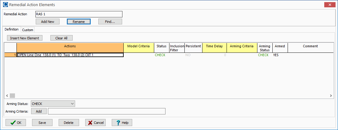 If specified, Arming Criteria can be either a Model Condition or Model Filter. This specifies a criterion under which a remedial action is armed. In order for a remedial action to actually be applied it must first be armed. The Arming Criteria is always evaluated in the contingency reference state. The Arming Status field determines if the Arming Criteria needs to be evaluated or if the remedial action is simply always armed or never armed.