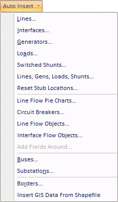 Auto Insert Menu The first six options are used to automatically insert network display objects that are connected to bus objects that have already been drawn on the oneline. Lines : Shows the Automatically Insert Lines Dialog Interfaces : Shows the Automatically Insert Interfaces Dialog Generators : Shows the Automatically Insert Generators Dialog Loads : Shows the Automatically Insert Loads Dialog Switched Shunts : Shows the Automatically Insert Switched Shunts Dialog Lines, Gens, Loads, Shunts : Shows a dialog for auto-inserting lines, generators, loads, and shunts simultaneously. Reset Stub Locations : Will completely redo the positioning of objects anchored to buses and substations in the manner done when auto-inserting lines, gens, load, and switched shunts.