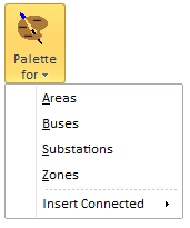 Palette for Menu Choosing any of the first four items in the Show Insert Palette for Menu will open up its respective Insert Palette. This Insert palettes show a list of all objects that are already shown on the oneline diagram as well as a list of objects which are not. For more information see the Using the Insert Palettes help topic. The Insert Connected option will be enabled if a single bus object is selected on the oneline. This submenu provides options to automatically insert any buses not already shown on the oneline that are connected to the selected bus. Additional options allow inserting the connected buses along with connected transmission lines or inserting connected buses along with connected transmission lines, generators, loads, and shunts. |