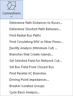 The Connection Menus contains actions related to analyzing the interconnectedness of the network model. These may be considered Graph Theory routines.