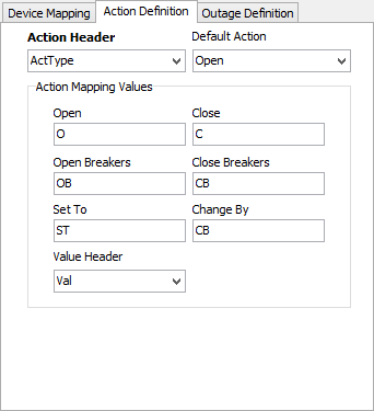 The Action Definition tab provides mapping from fields in the CSV defining the action to be applied to the specified device. If the CSV file contains only one type of action, the Action Header drop down can be set to "Use Default", and whichever action is specified by the Default Action drop down will be used on import.