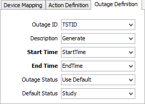 The Outage Definition tab maps values specific to Scheduled Outage configuration. If the CSV file does not include a field for an ID grouping outage actions, an ID can be generated for each row. Likewise, if no column exists specifying a human-readable description of the outage, a rough description can be generated. If the CSV file does not have a column specifying a Scheduled Outage Status, a default value may be specified. Start Time and End Time are the two required fields -- to be a scheduled outage, there must be scheduling information.