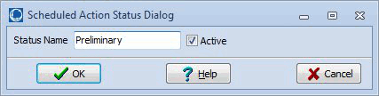 The Scheduled Action Status dialog allows the name and active state of a Status to be set.