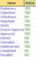 Scheduled Action Statuses are organizational tags to classify Scheduled Action Groups. A Scheduled Action Group with an Active status can be applied to the system with the Scheduled Actions Dialog; groups with Inactive statuses can be viewed in the Gantt Chart display in that dialog, but have no effect on the system at any time. The following Statuses are defined by default: