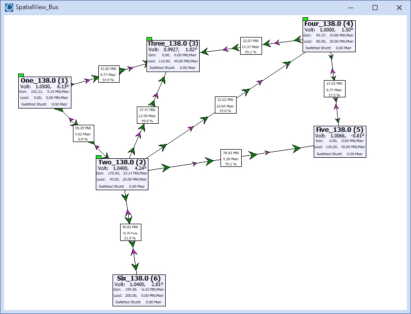 The GLSOs are the lines connecting the buses with field information showing the MW and Mvar flows and the maximum percent of the line limit. The magnitude of the MW and Mvar flows are taken at the end of the line with the lowest bus number. If there are multiple lines between two buses, the GLSOs are the summation of the flows on all of these lines. The GLSOs are drawn using the Default Drawing Values for Transmission Line thickness and color based on the nominal kV level. Transformers will be drawn with thicker lines in which the inner color stripe is the lower nominval kV level and the outer color stripes are the higher nominal kV level. Green arrows on the lines show the direction of MW flow, and magenta arrows show the direction of Mvar flow. Right-click options are available for the GLSOs to show the information dialogs for the component line(s).