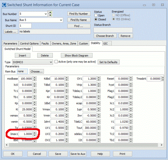 Please NOTE that the Bmax, Bmin and Imax1 are in pu in the transient model and in the power flow control options the limits are in Nom Mvar for SVSMO1 and SVSMO2, and in Nom Amps for SVSMO3. The SVSMO2 Min and Max values are determined by the switched blocks.