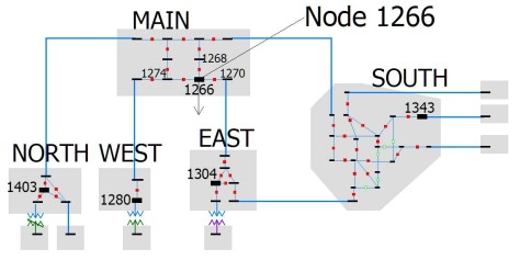An example full-topology model is shown below. Each gray region represents a superbus. The large buses and numbers in each superbus represent the primary bus for that superbus.