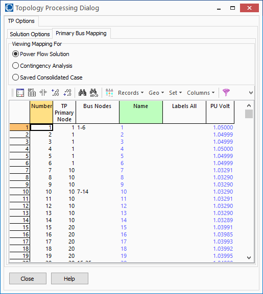 Sometimes, it is necessary to explore or export the topology relations between superbuses and buses in the Full-Topology Model and its Consolidated Representation. Because different sets of switching devices can be preserved by Simulator when solving the Power Flow Using Topology Processing, when solving the Contingency Analysis Using Topology Processing, and when Saving the Planning Case, there will be different mappings for each one of these actions.