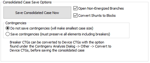All the contingencies, the contingency actions, and all the switching devices included in contingency actions will be preserved and saved in the consolidated case. It makes a big difference to perform a Breaker-to-Device Contingency Conversion before saving the case. Usually most of the breaker contingencies can be converted to device contingencies requiring just a small number of breakers to be preserved in the case. Some planning tools have limitations regarding the number of low impedance branches that can be modeled and will not be able to read and solve the Planning Case if it contains a large number of switching devices.