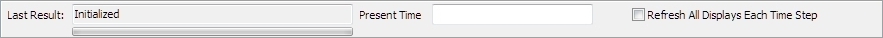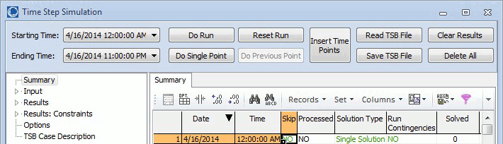 Press this button to initialize the Time Step Simulation and go through all the time points until the last time point or a time point with theSkip field set to Pause is found. As the simulation takes place, the Last Result Boxwill be updated with messages. In addition, the Summary page will change the Processed and Solved fields from NO to YES, reflecting the simulation progress. The Results grids will be updated once the solution for a time point has been found.