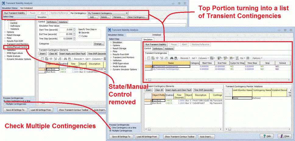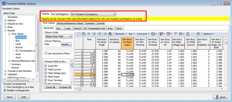Most of the help documentation discusses how Transient Stability Dialog functions when you are simulating only a single transient contingency event. When changing the Process Contingencies option to Multiple Contingencies instead, the dialog will change in small ways throughout. This topic discusses how the dialog behaves differently when running multiple contingencies.