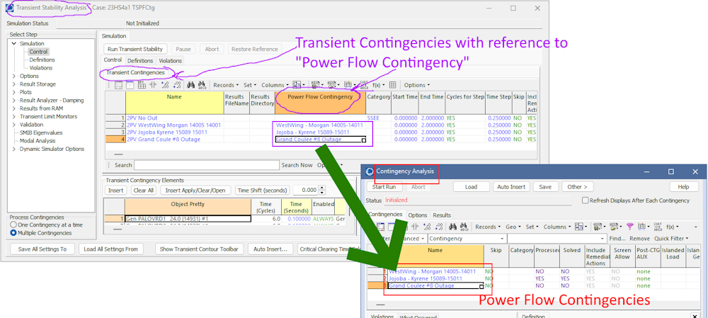 Each TSContingency may assign a field for PowerFlowContingency which specifies a Power Flow Contingency that represents the initial condition for the Transient Contingency simulation.