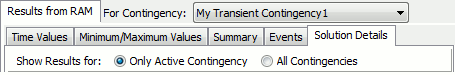 Note that in Results from RAM tab to Show Multiple Contingencies Events when Multiple Contingencies are being processed, there is an option to Show Results for - Only Active Contingency or All Contingencies that is available for Minimum/Maximum Values, Events, and Solution Details tabs. Only Active Contingency will how the results for the current active contingency, or All Contingencies will show the results for all of the contingencies in transient stability: