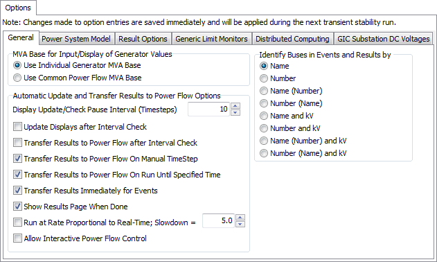 The General sub-tab is found on the Options page of the Transient Stability Analysis dialog. This contains various choices of how data is displayed in the user interface and how you interact with the user interface.