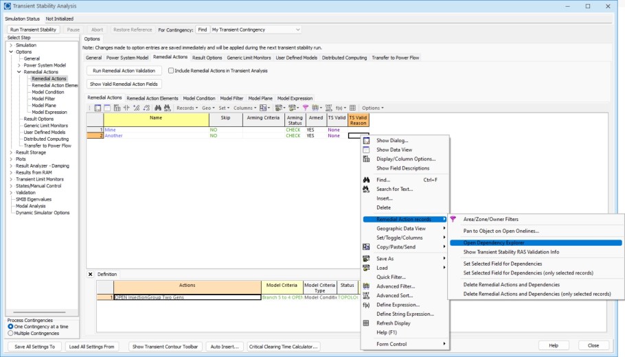 More types of actions are available with steady-state remedial action definitions than those available for transient stability. More fields for inclusion with criteria monitoring are available with steady-state definitions than those available for transient stability. A validation tool is available to provide guidance on what is supported with transient stability. This validation tool can be run by clicking the Run Remedial Action Validation button on the Remedial Actions tab of the Transient Stability dialog.