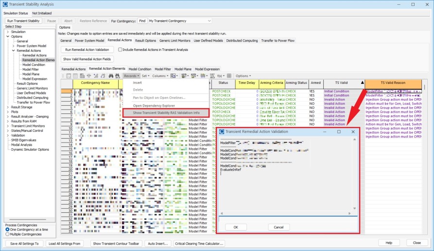 The local menu option to Show Transient Stability RAS Validation is intended to help read the TS Valid Reason by spreading it out into different objects in the hierarchy as shown in the example below. Local menu option to Show Transient Stability RAS Validation Info will open a dialog showing the TS Valid Reason field but in an easier to read format: