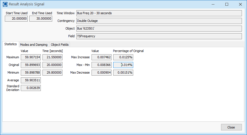 When performing results analysis on defined Transient Stability Result Analaysis Time Windows, with every signal being analyzed and PowerWorld will store the original, maximum, minimum, average and standard deviation of the signal. The time at which the minimum and maximum occurred will also be stored. These values can then be presented in the table of Signal Statistics as shown in the first image below. In addition a dialog exists as shown second image below.