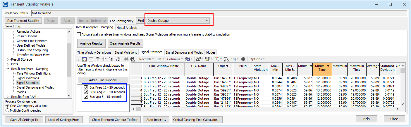 When looking at the statistics, the display is filtered to show only the contingency chosen from the contingency drop-down shown in the red box below. In addition to make filtering by particular time windows, there is a display listing all time windows in the blue box below. By checking or unchecking particular time windows the list of signals is filtered. Each row in the table represents a particular field of a particular object and we call each of these rows a "TSResultAnalysisSignal". The statistic values are then shown as columns.