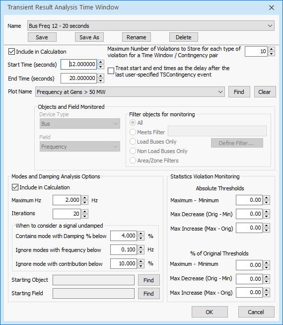 The Transient Stability Analysis Time Window (TSResultAnalysisTimeWindow) is an object created by the user to specify which signals to analyze and between which start and end time. The input dialog for this option is shown below and the case information display showing a list of define time windows follows this.