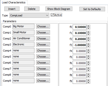 The fractions associated with the model apply only to the MWs. As a result, the initial Mvar associated with each load component's characteristic must be determined by the characteristic from the initial voltage and MW. Thus as of the release of Simulator Version 20 the available models for CompLoad are restricted to CIM5, CIM6, CIMW, IEEL, LD1PAC, LD1PAC_CMP, LDELEC, MOTORW, MOTORX, and MOTOR_CMP. Existing hard-coded composite models such as CMPLDW, CLOD, and CMLD will not be added in the future, as this CompLoad is meant to replace those. As future load models are added this support will be included.