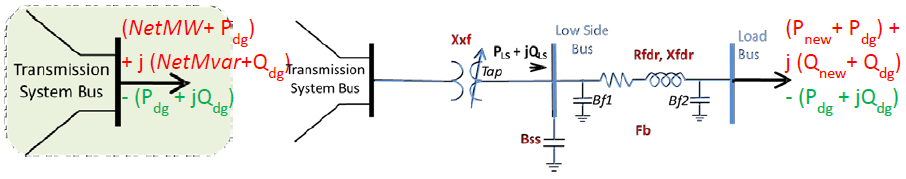 When including the distributed generation model portion, then this same process will occur, but the portion of the load representing distributed generation would translate directly to the load bus, so you’d translate the “Pdg + jQdg” directly to the distributed generation model down at the end of the distribution equivalent. The load amounts then are processed by the load characteristic models in the same manner as with any load characteristic with the amount of MW and Mvar would be modified to “(Pnew+ Pdg) + j (Qnew+ Qdg)”. This is described visually as follows.