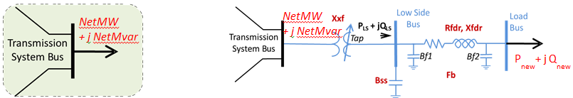 Consider the example below. Presently it takes the “NetMW +jNewMvar” as the P and Q taken from the initial condition of the power flow case seen at the transmission bus. It then goes through a process of translating this P+jQ across a transformer and feeder and ultimately there is a “Pnew + jQnew” seen at the Load Bus. This Pnew+jQnew is then applied to the load model parameters. (We’re leaving out some details here related to the Fb term and initializing motors, but this is the general idea).