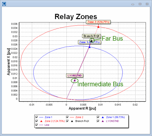 Also for impedance-based distance relays for which a "Far Bus" is specified (such as ZLIN1, ZQLIN1, ZPOTT, etc...), then Simulator will automatically start at the Device Location bus of the branch and do a topology search of the network to find the series of branches that get to the "Far Bus". The Reach Percentage is then based on the sum of branch impedances on the series path found. In addition the Show Relay Zones feature will include additional information about the intermediate points found as this series path is traversed.