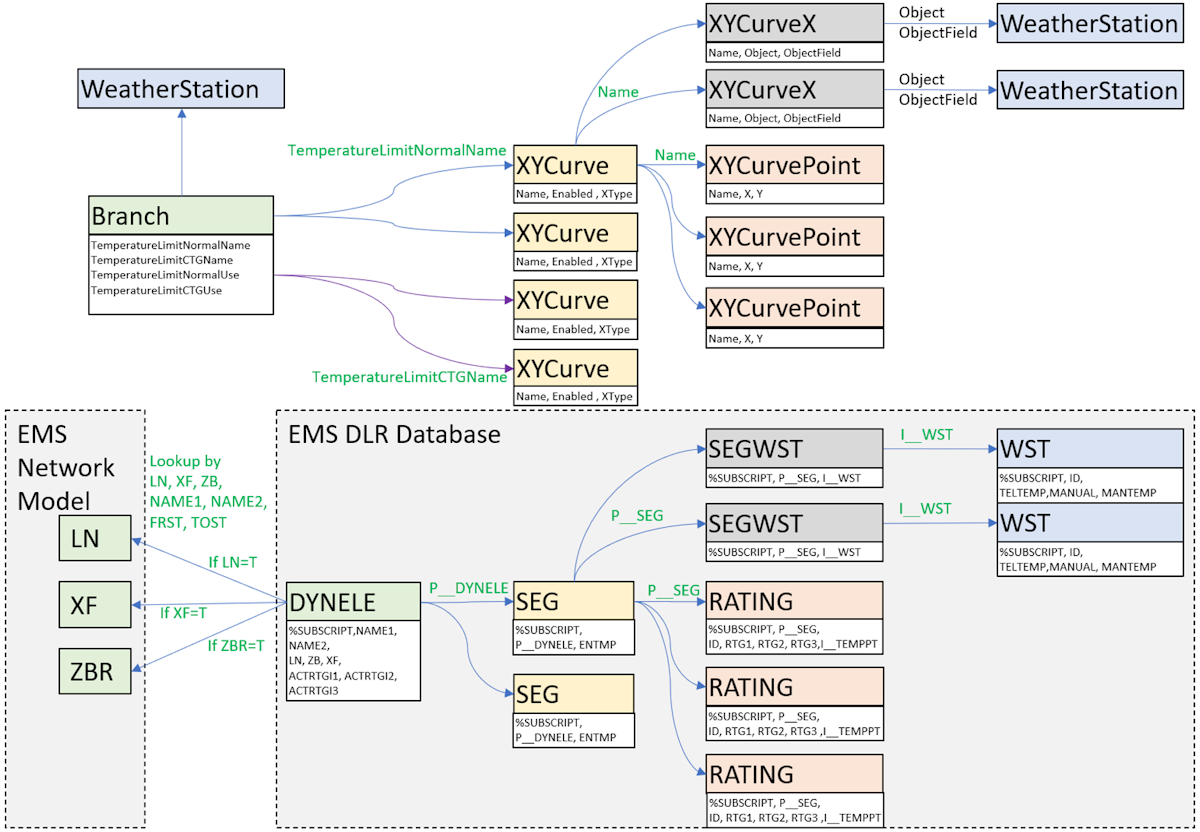 The relationship of DLR records to PowerWorld Simulator object data structures is depicted in the image below and a detailed description of each object follows. In general the objects in the EMS DLR Database represent objects in Simulator as follows.