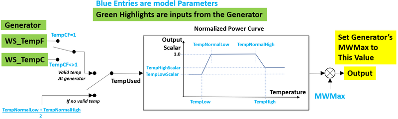 This model takes the temperature at the generator (in either Fahrenheit or Celsisus depending on the input parameter TempCF) and converts this into a normalized output scalar as shown in the figure below. This normalized value is then multiplied by the model parameter MWMax to create the output of the Wind Model which represents the weather-dependent MWMax value that should be used by the generator.