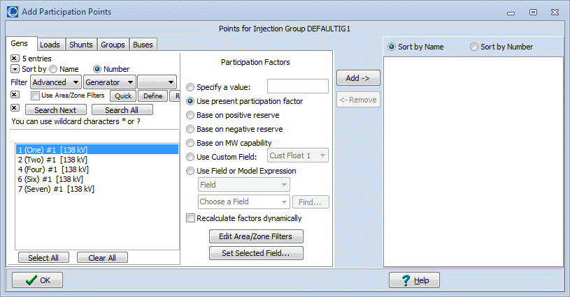 For generators, a value can be specified, the generator’s present participation factor (which comes from the case and is displayed in the Generator Display) can be used, the participation factor can be calculated as the difference between its present output and either the unit maximum or minimum, its maximum output capability can be used, or the value contained in a selected Custom Field can be used.