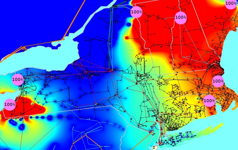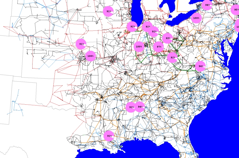 - A picture of most of the 100 kV and above transmission system in the Eastern Interconnect of the United States. The dynamically sized pie charts show lines loaded higher than 90%.
