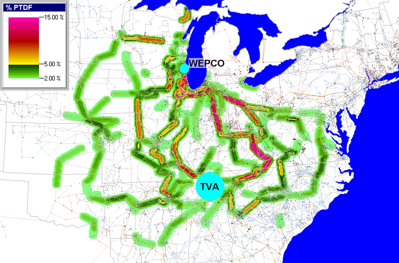 - Colors in this contour map represent Power Transfer Distribution Factor (PTDF) values—the percentages of a transaction that would loop over various grid components—for a hypothetical transfer between a utility in Eastern Wisconsin and the Tennessee Valley Authority (TVA). Values range from 2 percent [green], to 5 percent [yellow], to 15 percent [red].