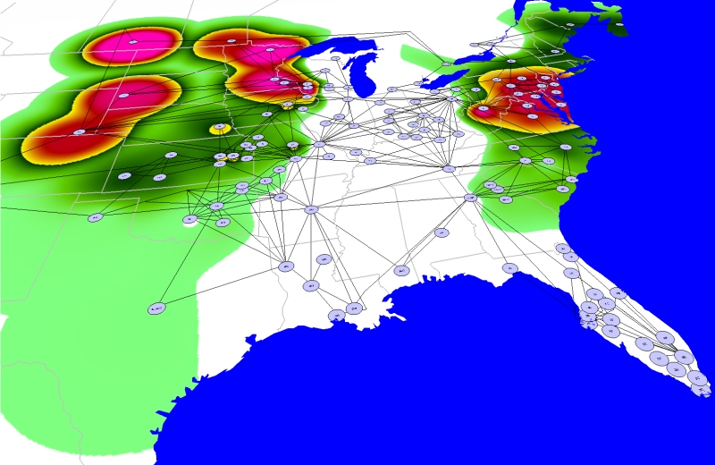- This contour map highlights salient features of the situation during a major price spike in the Mid West. The ovals represent potential sellers of electricity, and the lines represent abstracted images of transmission routes and tie-lines between the chief operating regions. The contours, ranging in degrees of escalating severity [from green to red], show how much system components would be overloaded if a utility in northern Illinois purchased electricity in the wholesale market. The Eau Claire–Arpin transmission line and Kammer transformer were key chokepoints.