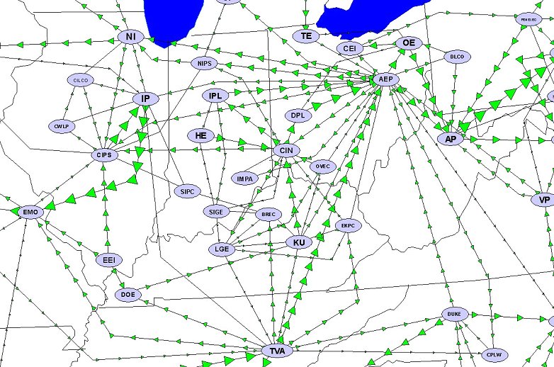 - Area, Zone, Group Diagrams: This area diagram represents control areas as bubbles and animates interface flows. Interfaces can be automatically defined as the collection of tie-lines between areas, zones, or injection groups.
